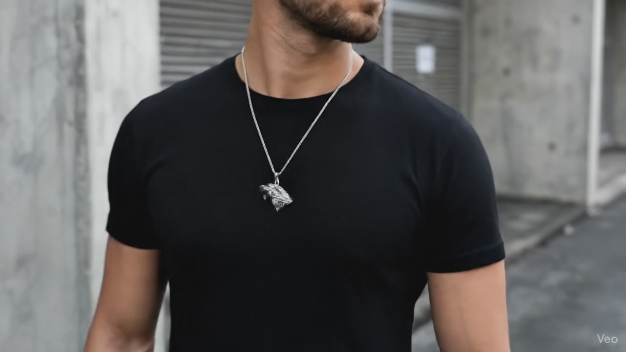 Sculpted with exacting detail, this pendant captures the profile of the apex predator. A symbol of the relentless pursuit of survival. The detailed casting highlights every contour of the fur and structure, finished in a cold, brushed silver tone.
